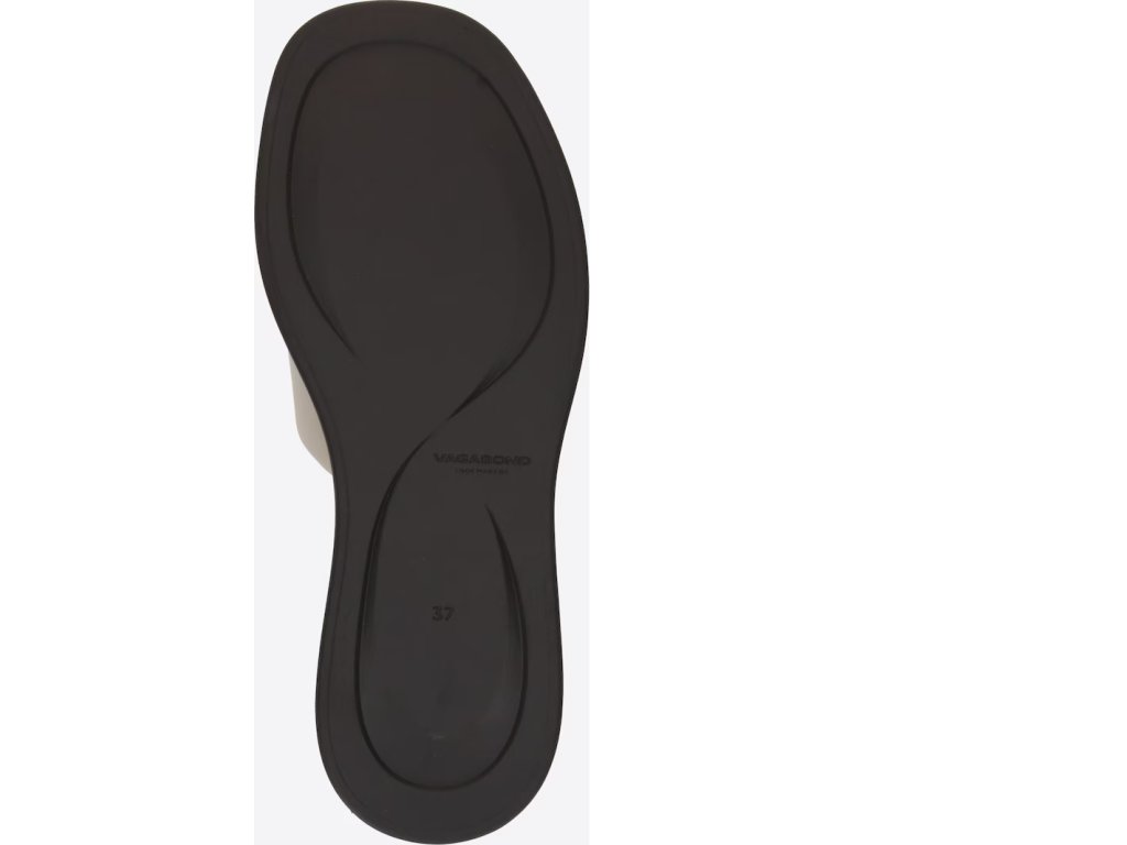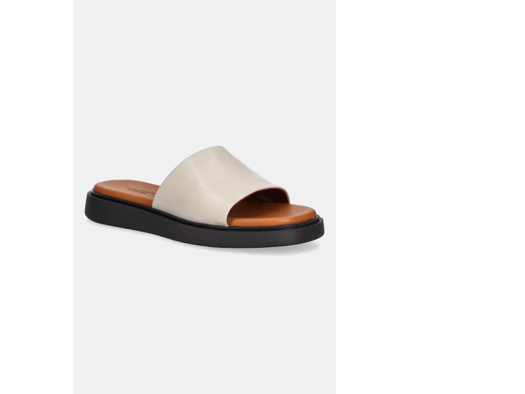 Tento model je vyroben z béžové kůže, má jednopáskový design, hranatý tvar špičky a polstrované stélky. Elegantní podrážky měří 20 mm.